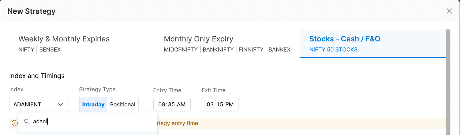 - Select the index you want to trade in this strategy we will select “Adani Enterprises Limited”.