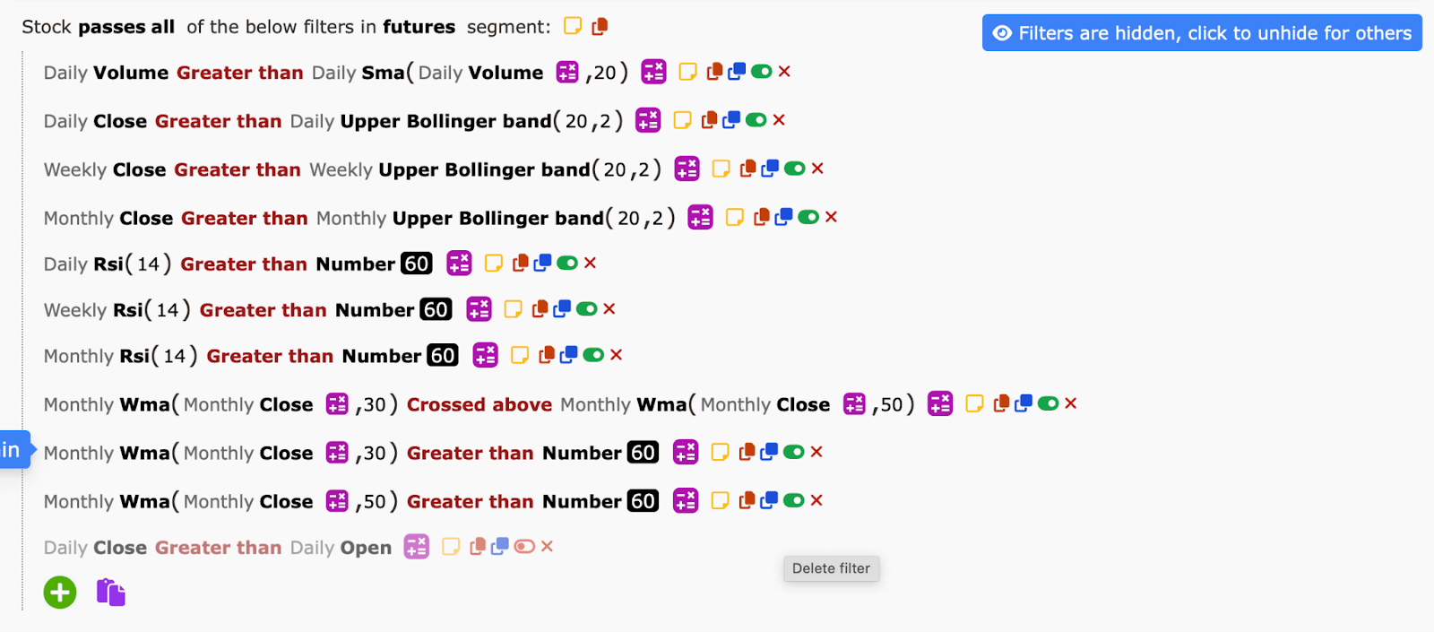 - The filter checks if the monthly RSI (Relative Strength Index) with a 14-period setting is greater than 60. This means that the stock is considered to be in a strong upward momentum, as an RSI above 60 indicates that the stock has gained more than 60% of its average gains over the specified period, suggesting it may be overbought.