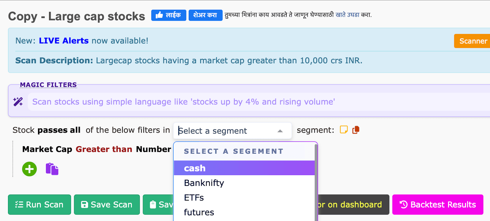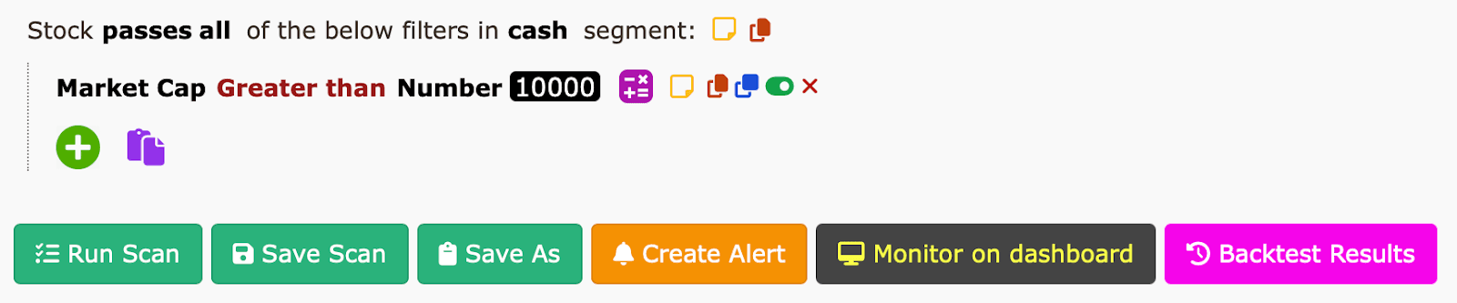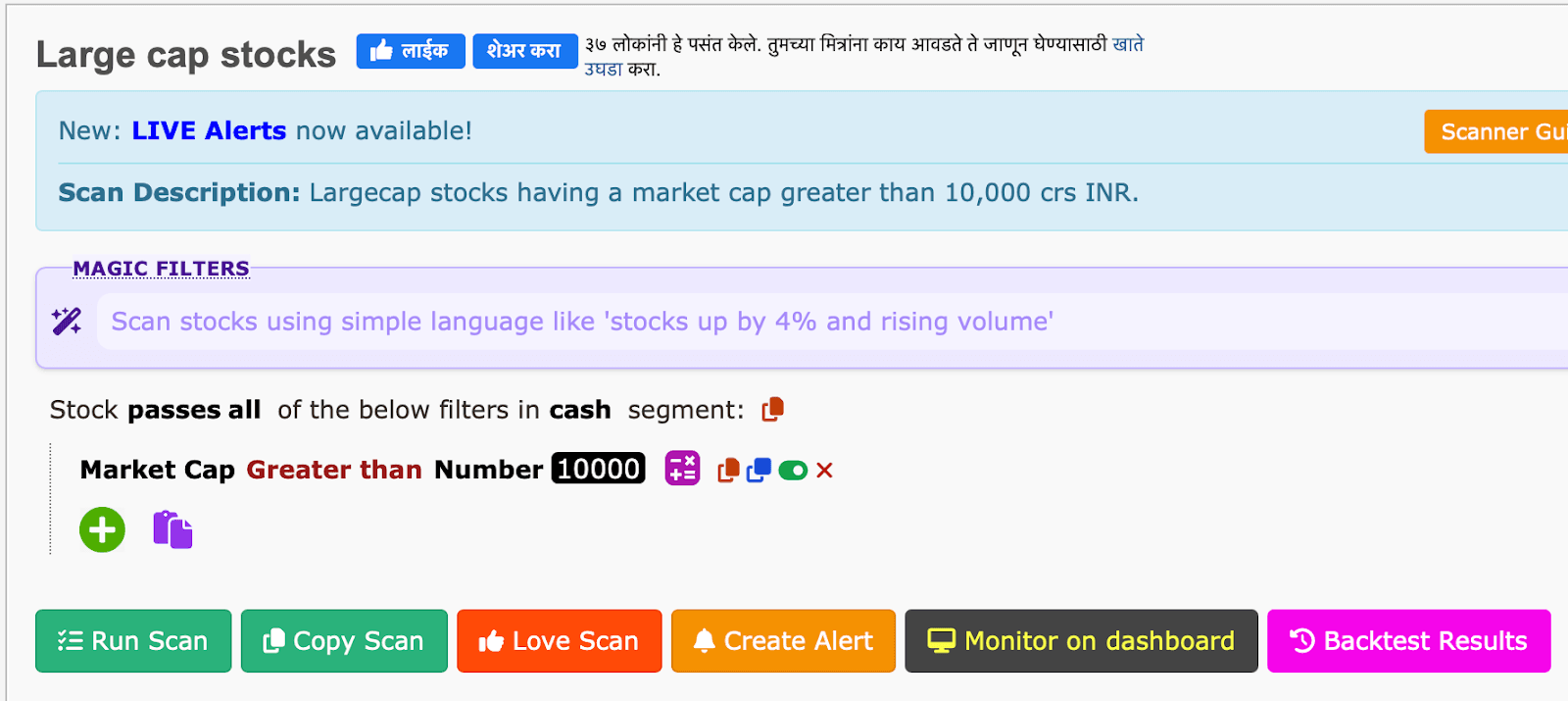- Market Cap is greater than 10,000 means the total value of the company's outstanding shares is more than 10,000 Indian Rupees. This indicates that the company is relatively larger and potentially more stable compared to smaller companies.