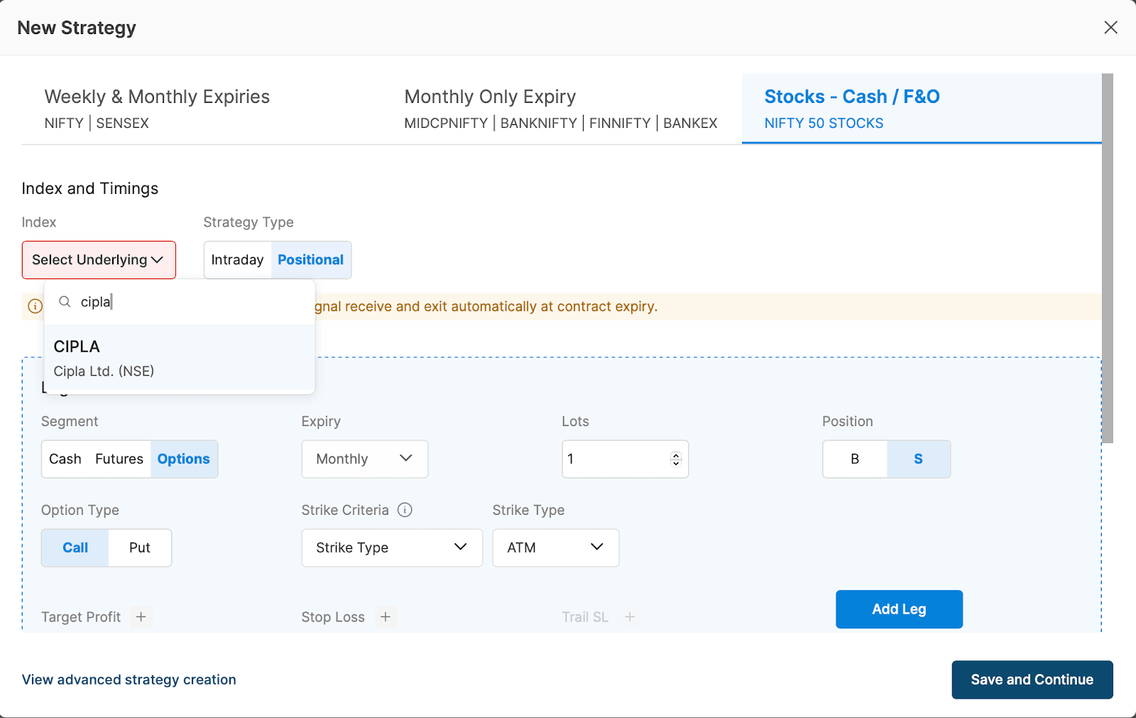 - Select the index you want to trade in this strategy we will select “CIPLA Ltd”.