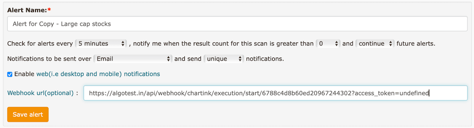 Link the Webhook to Chartink Alerts: