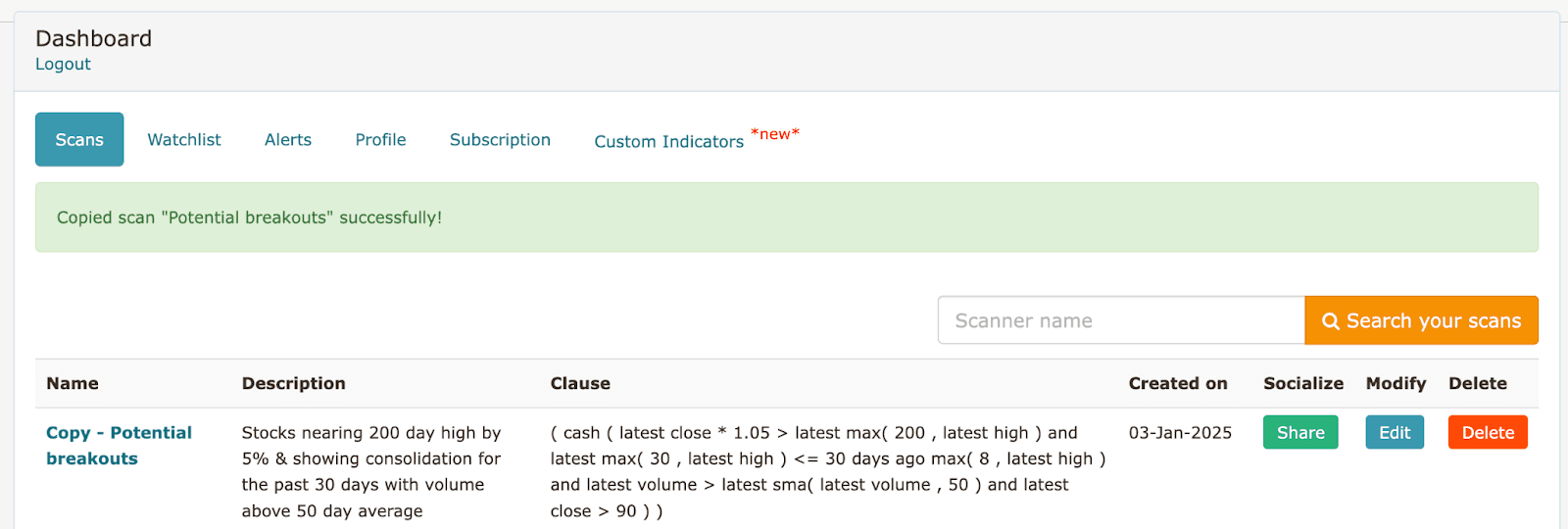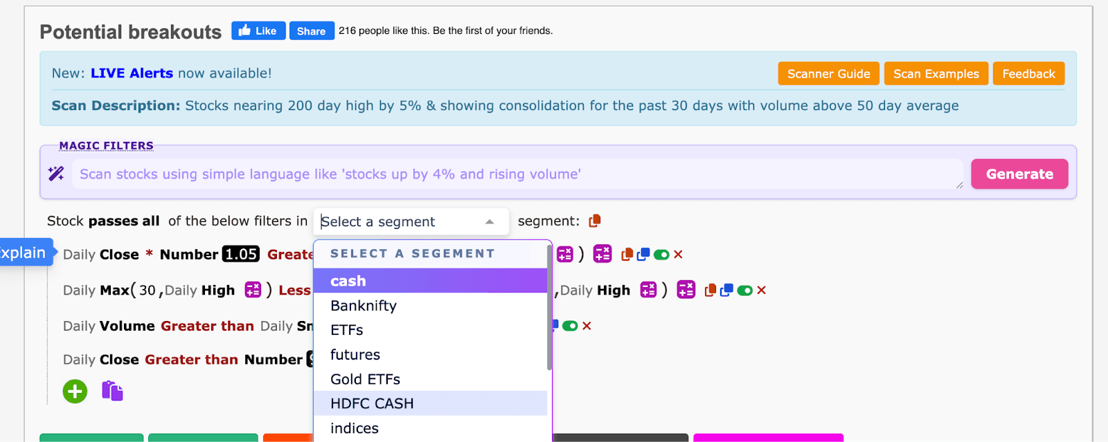 - Go to the "Screener" section and select any pre-existing template (e.g., "Potential Breakout").