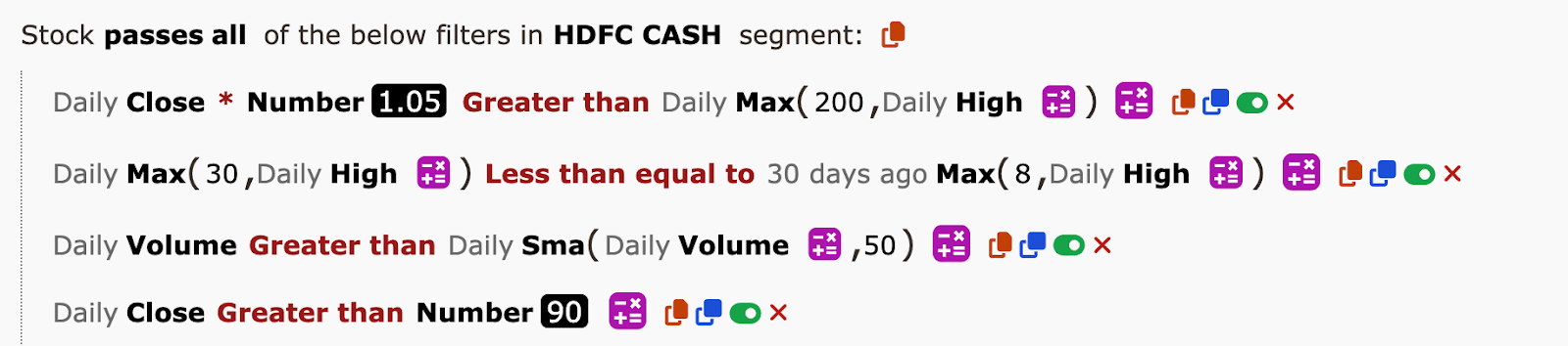- The daily closing price of the stock should be at least 5% higher than the maximum daily high price over the last 200 days. This means if the highest price in the last 200 days was ₹100, the closing price must be greater than ₹105 to meet this condition.