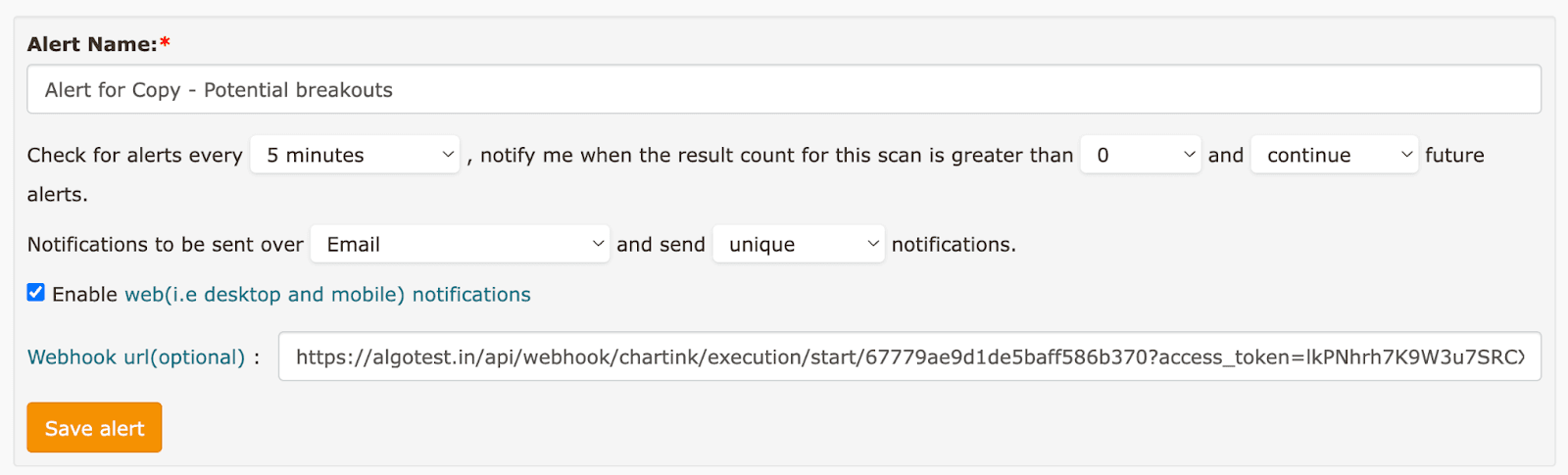 Link the Webhook to Chartink Alerts: