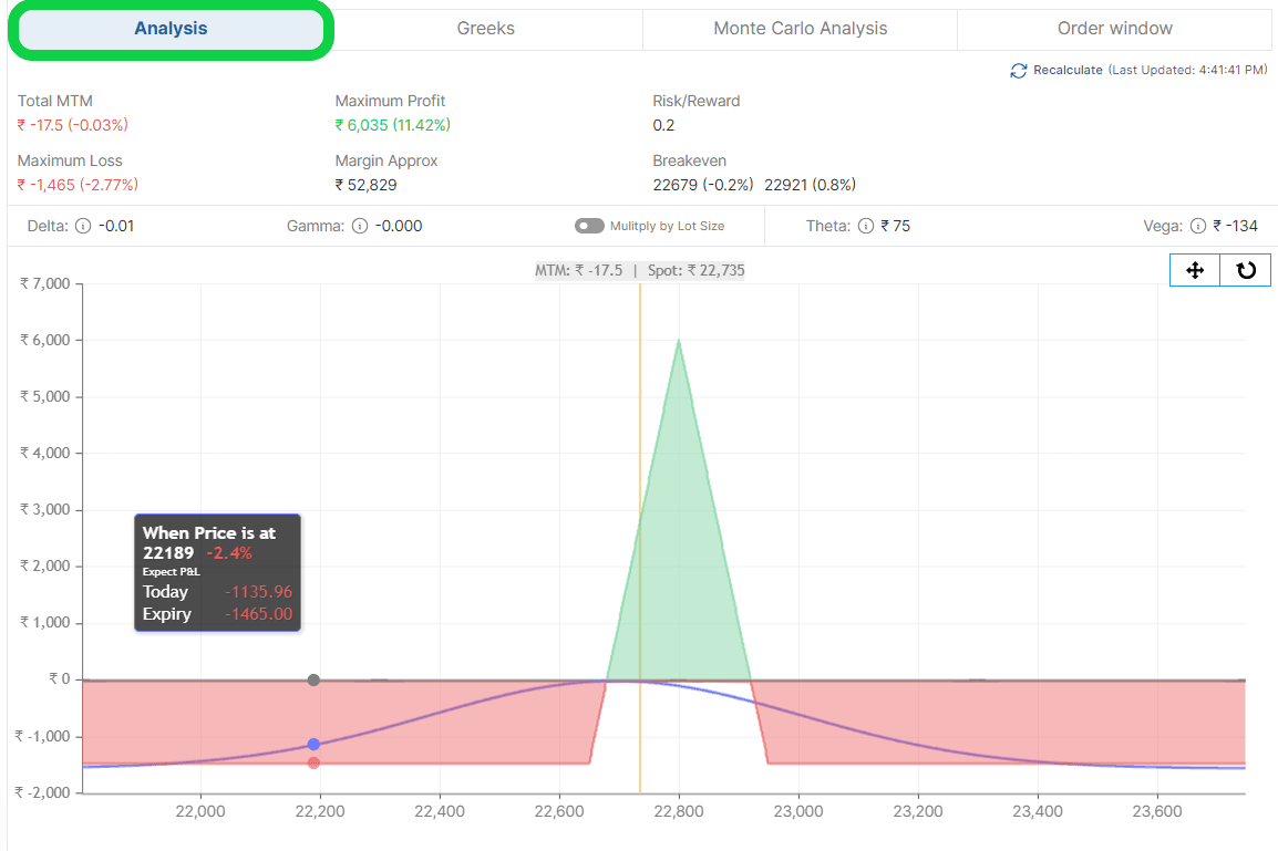 - In the Analysis section, Strategy Builder provides you with tools like Payoff graph, Maximum Profit, Maximum loss, Risk reward, Breakeven point, etc. to analyse your strategy. A payoff graph is a handy tool that helps you determine how your position is going to expire concerning the underlying move.