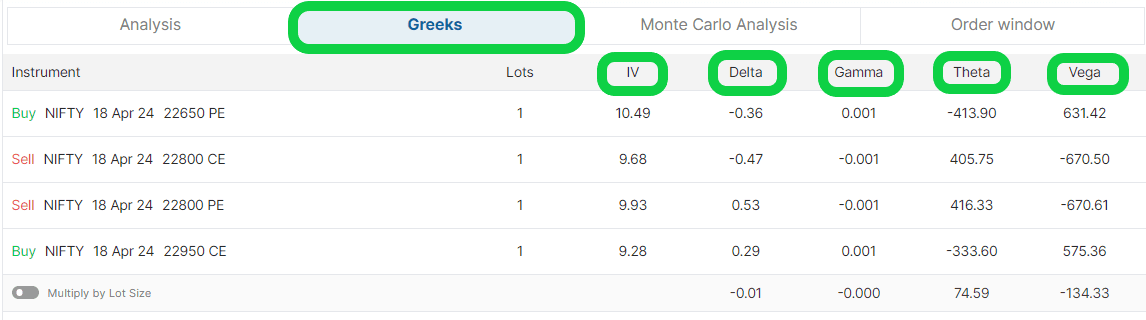 - In the Greek section, Strategy Builder provides you with information about Option Greeks like Delta, Theta, Gamma, IV, Vega, etc. for your positions, as shown in the image below.