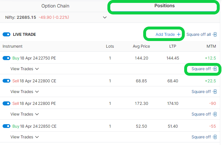 - You can manage your position on the “positions” tab. Here you get options to add another trade or square off existing positions, as shown in the image below.