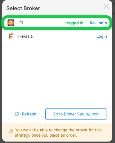 - It will ask you to select a broker. Select the broker and save the strategy with a random name.
