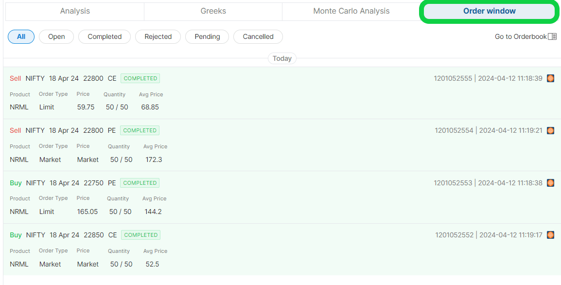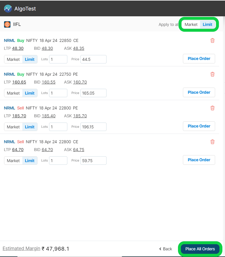- Now click on “Place All Orders” to execute our strategy. We also have the option to choose if we want to set the order type as limit or market.