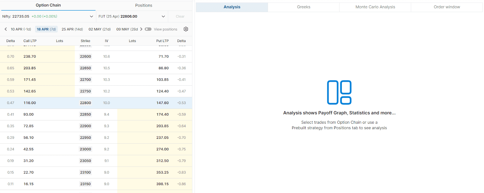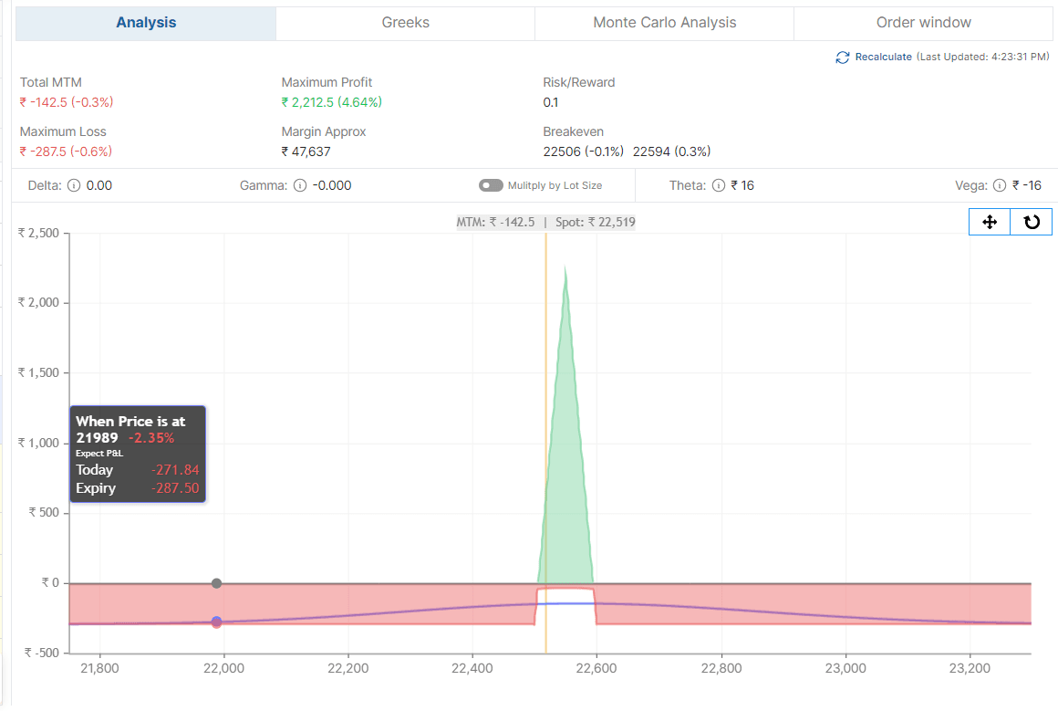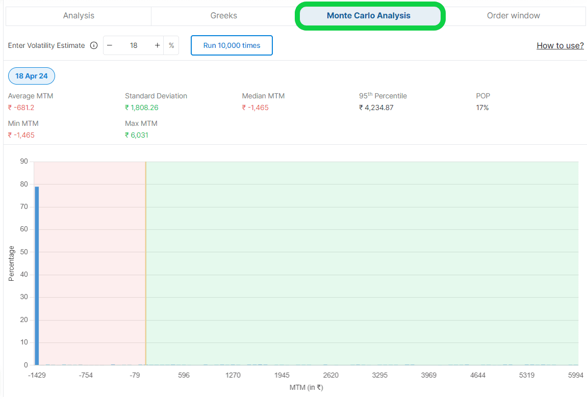 - In the Monte Carlo Analysis Section, Your PnL will depend highly on the underlying index's path. Monte Carlo analysis is an advanced method to see how your strategy will perform on average across 10,000 different price paths that the underlying could take until expiry. You can access this feature by clicking on “Monte Carlo Analysis,” as shown in the image below.