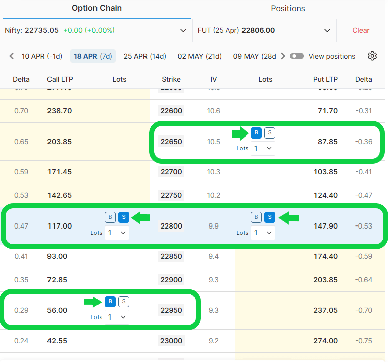 Step 4. Now add the legs from the option chain according to the strategy you want to build. Assuming we want to build an iron fly, we will sell ATM CE and ATM PE and buy OTM CE and OTM PE from the option chain as shown in the image below