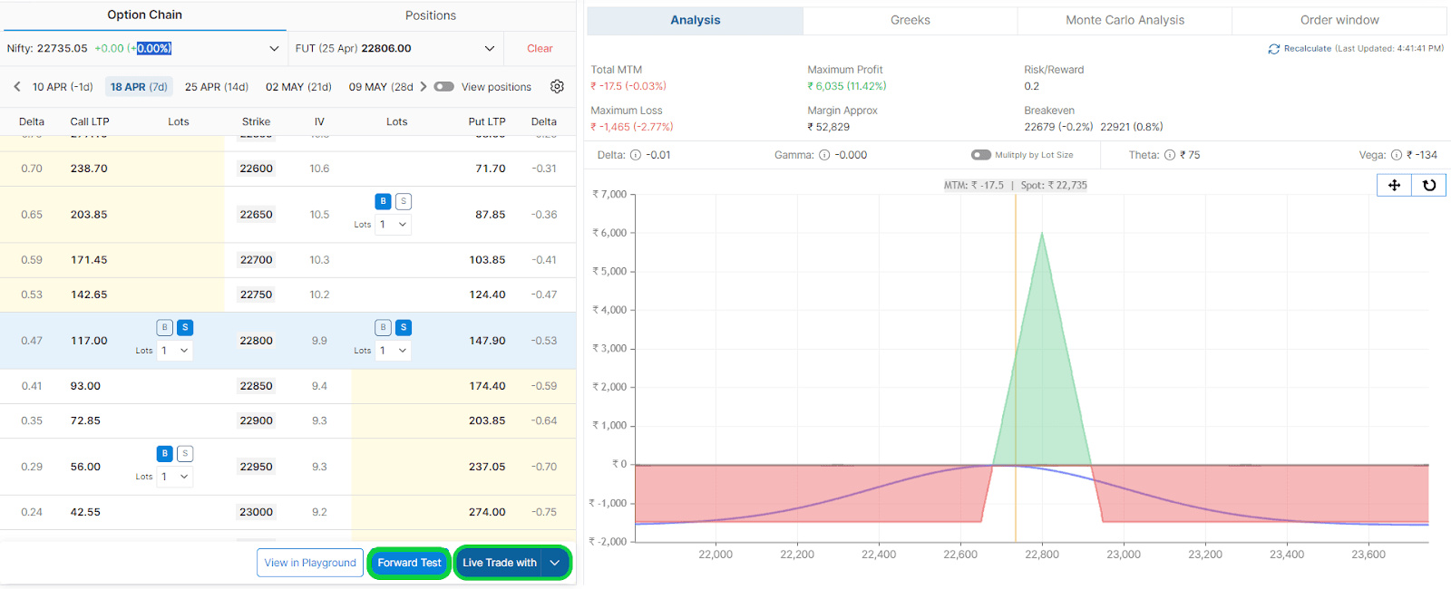 Furthermore, the Strategy Builder provides you with multiple tools for effectively analyzing your trades. AlgoTest's Options Strategy Builder provides tools such as option Greeks, Total MTM, Risk to Reward ratio, and more to help you create a profitable strategy.