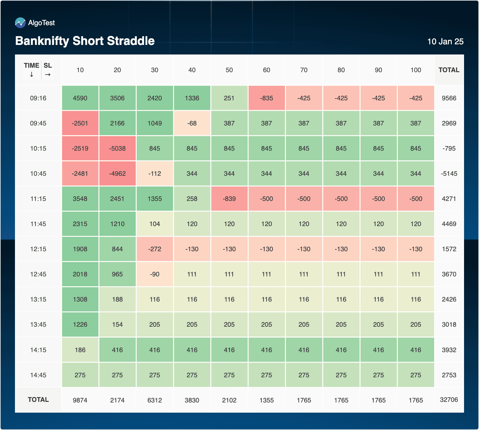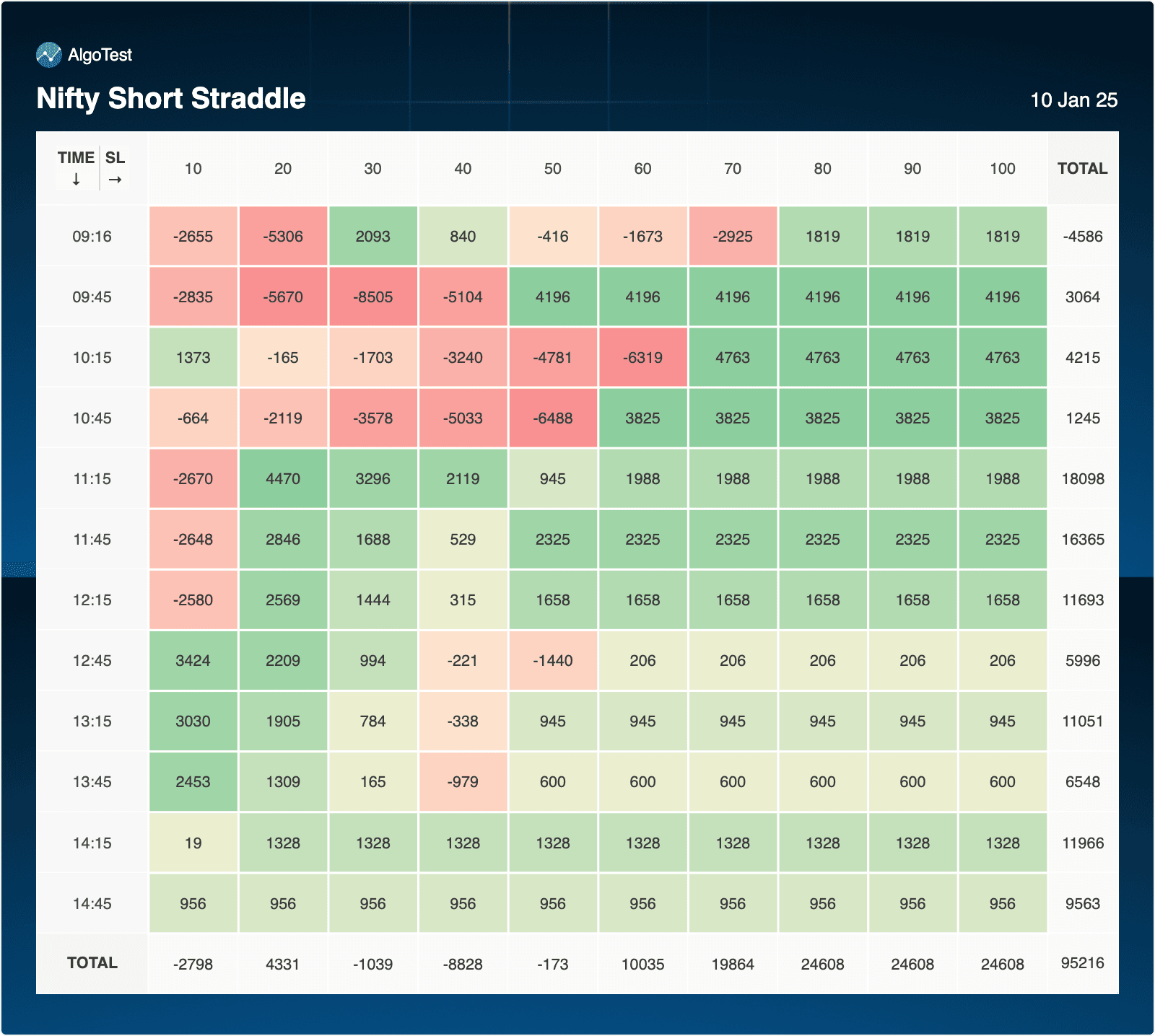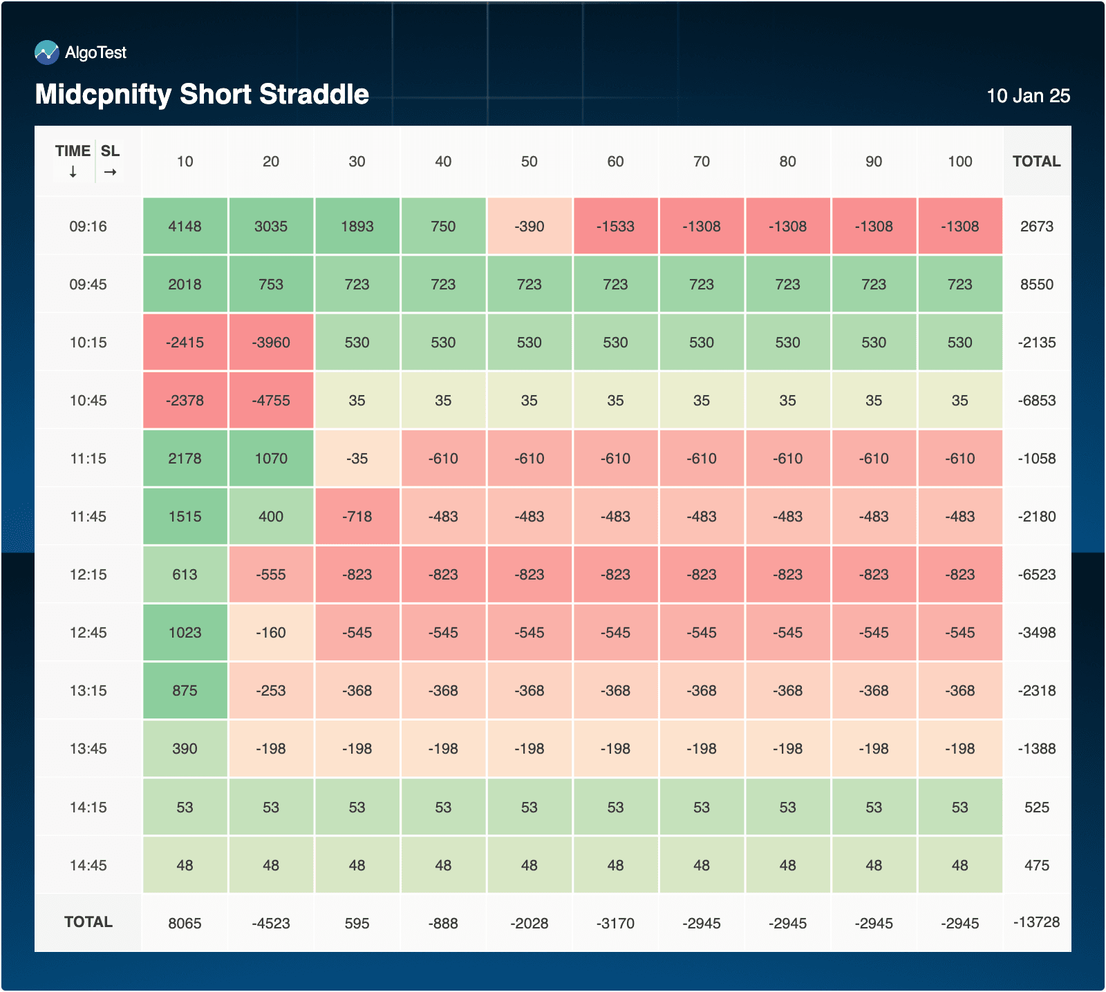 - 10:15 and 10:45 incurred heavy losses, with -3,960 and -4,755, respectively, at SL=20.