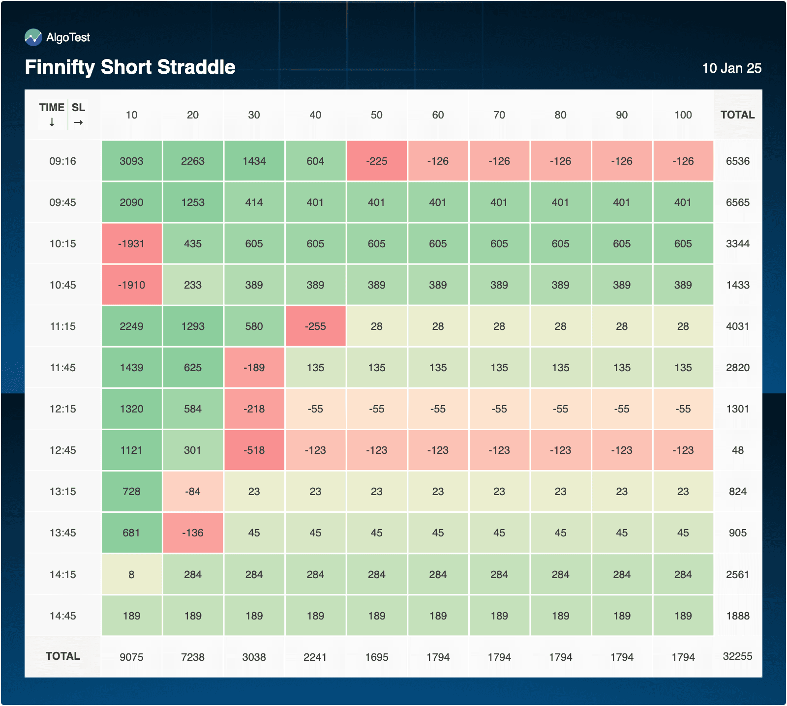 - 09:45 showed the highest profitability, with 8,550 at SL=50 and above.