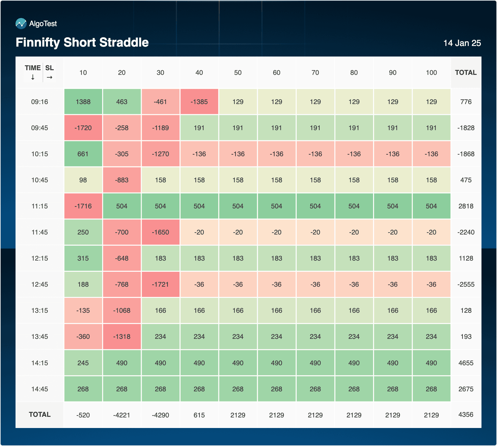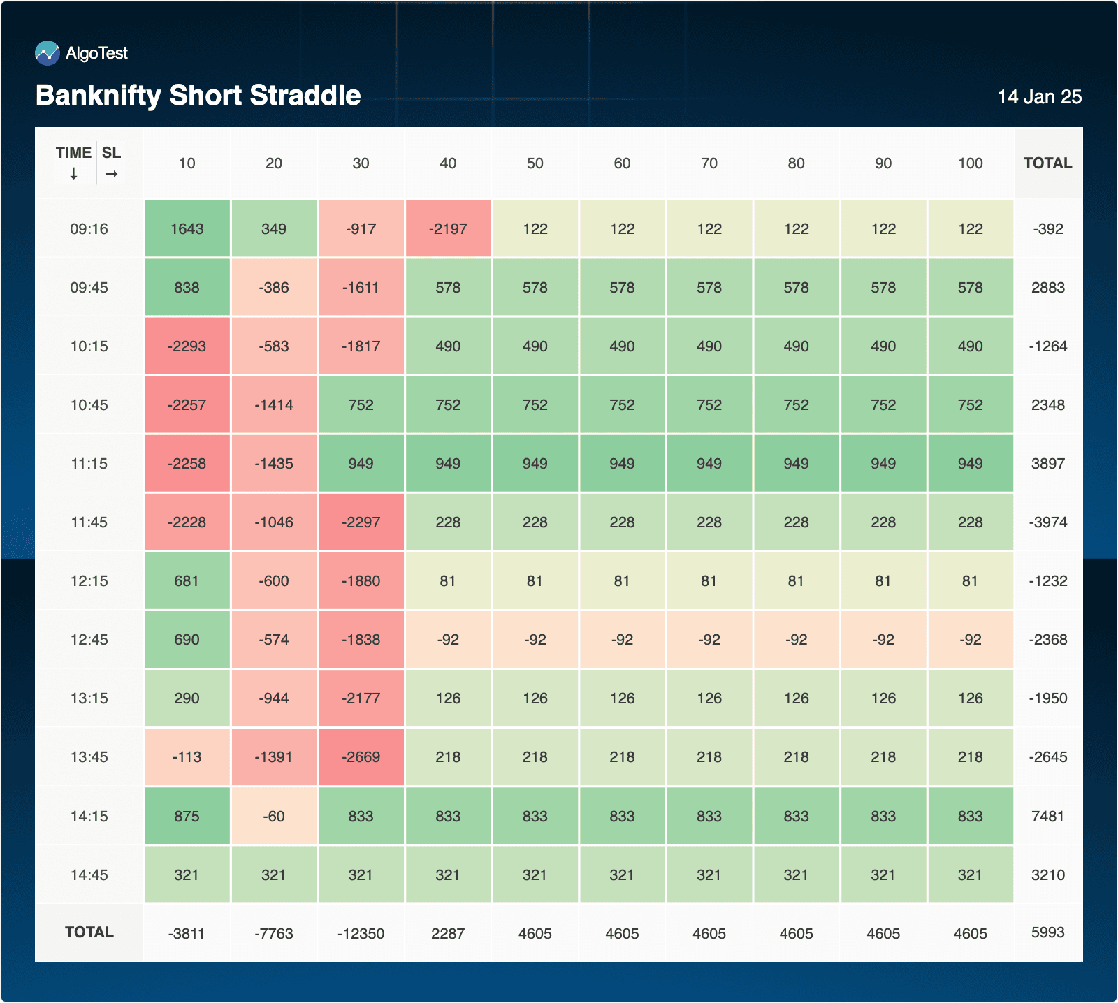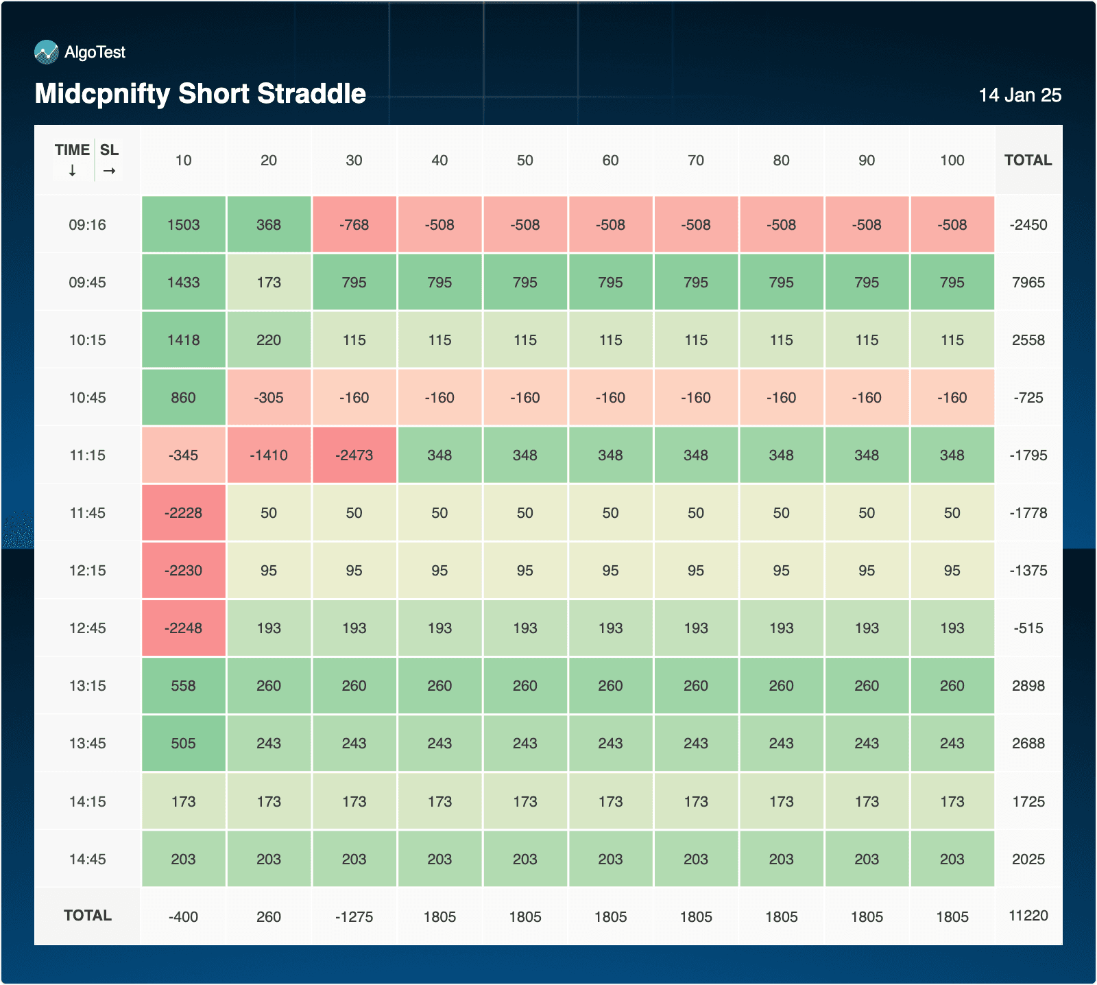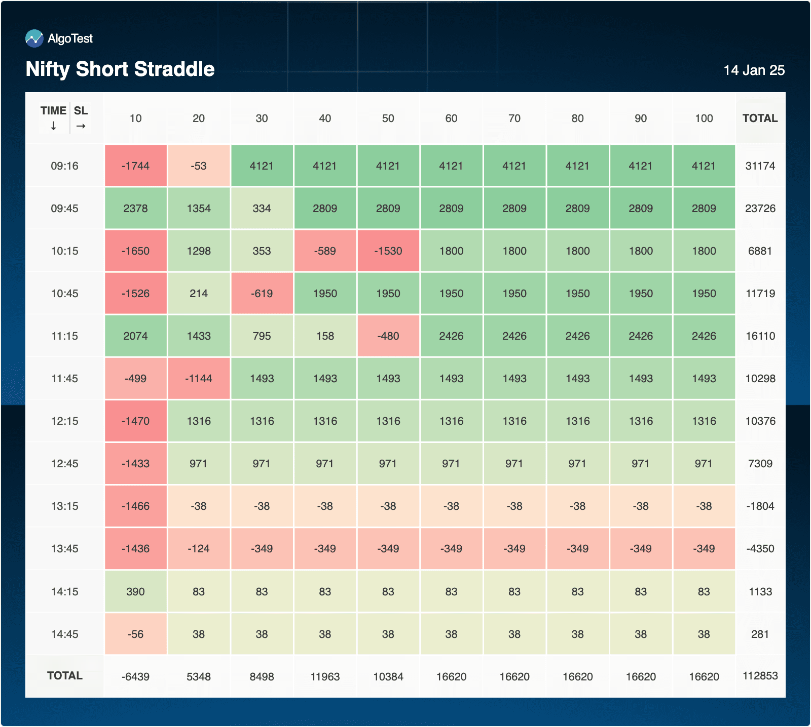AlgoTest heatmaps make it easier for you to understand a clear picture of your trading performance. These heatmaps visually represent data like time, performance metrics, and win rates. Think of them as a map highlighting where your strategies work best and where they stumble. For example, a heatmap might reveal that trades during certain hours of the day consistently yield higher profits.