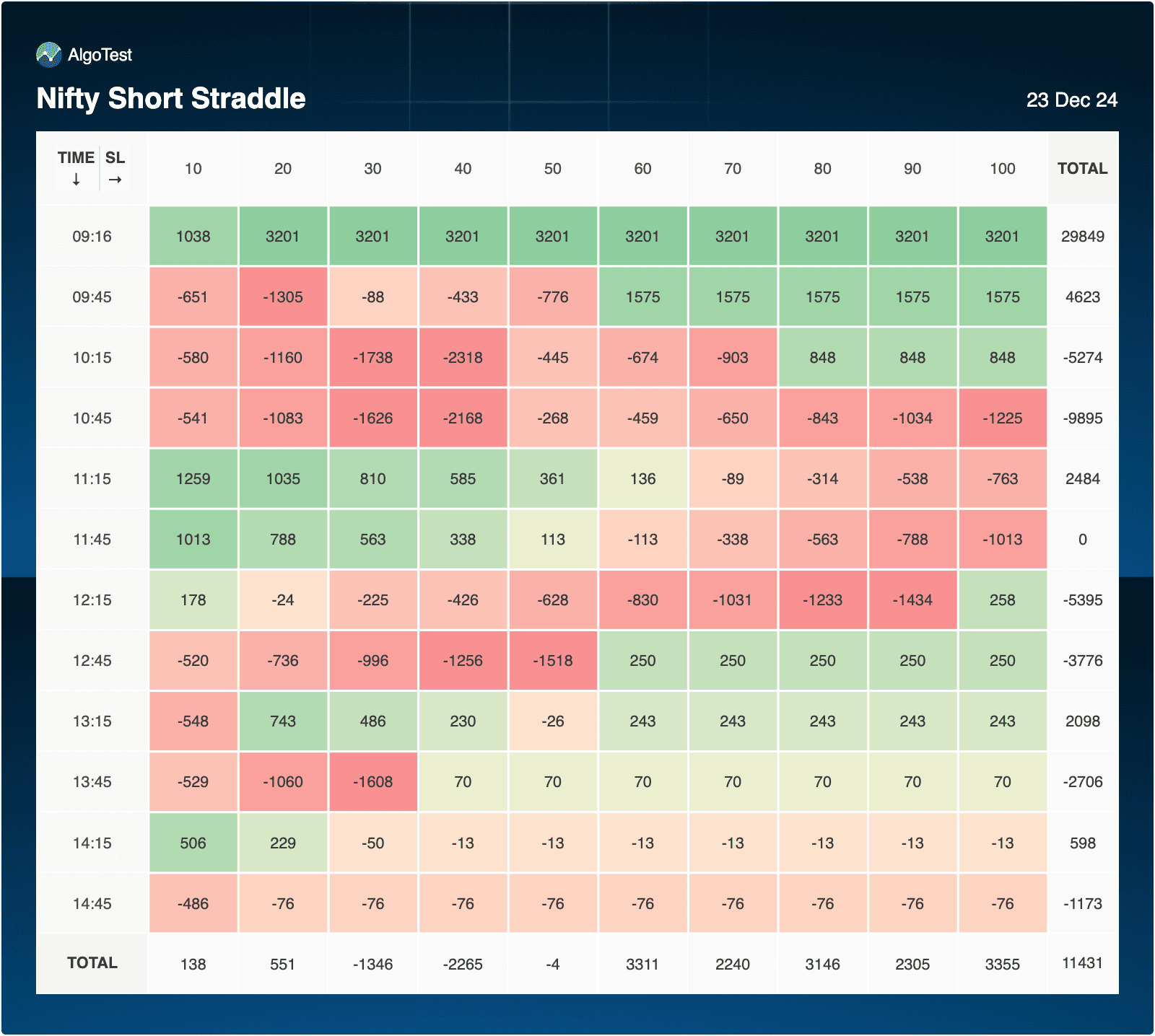 - Best performance is observed at the 9:16 entry with a profit of 35,188 across all SL levels, indicating low volatility immediately after the market opens.