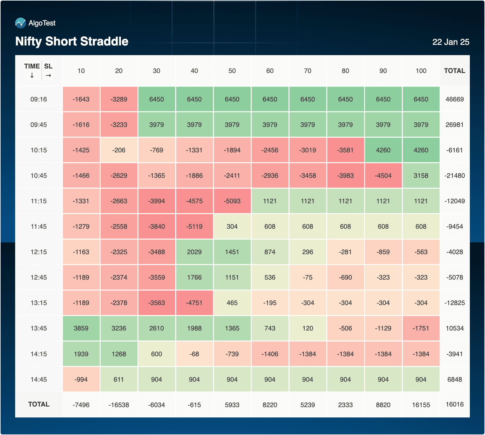 AlgoTest heatmaps make it easier for you to understand a clear picture of your trading performance. These heatmaps visually represent data like time, performance metrics, and win rates. Think of them as a map highlighting where your strategies work best and where they stumble. For example, a heatmap might reveal that trades during certain hours of the day consistently yield higher profits.