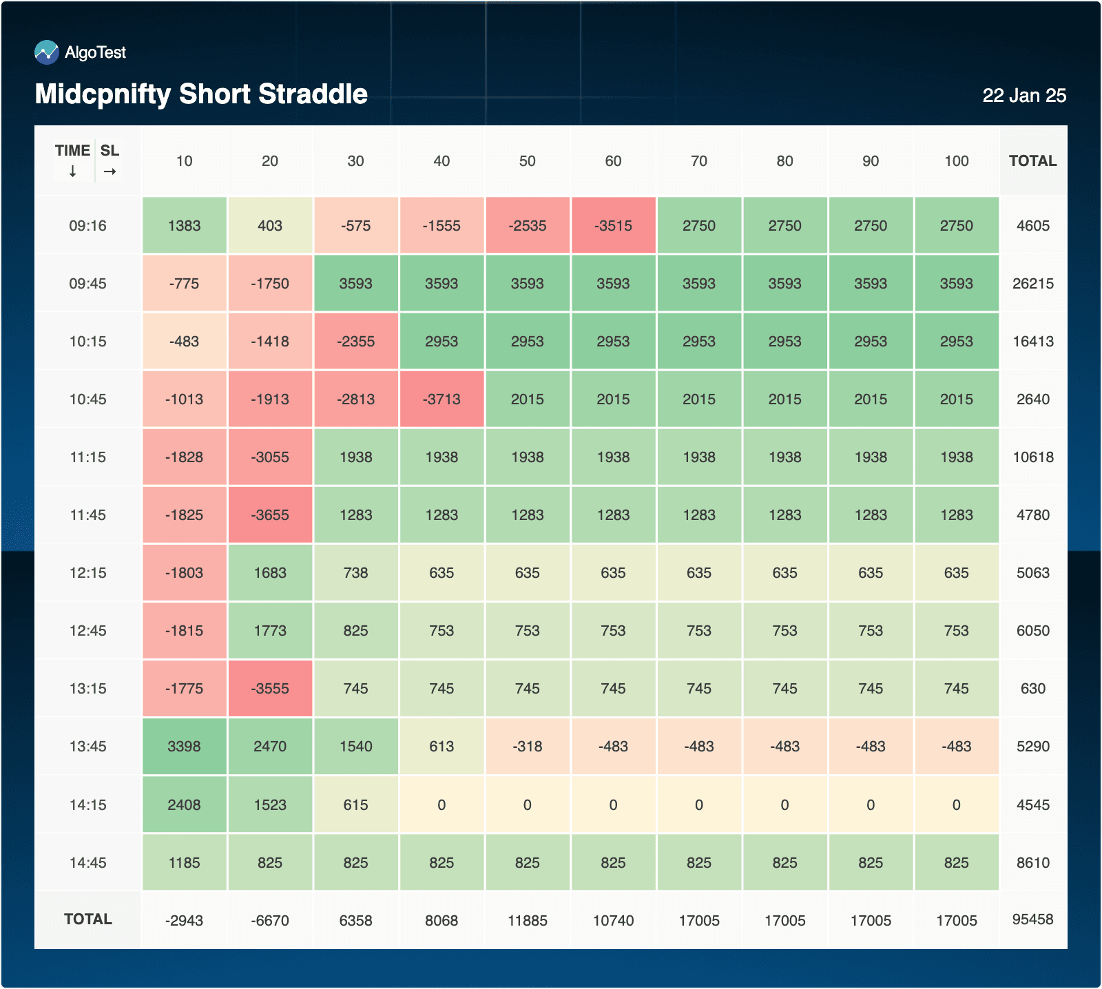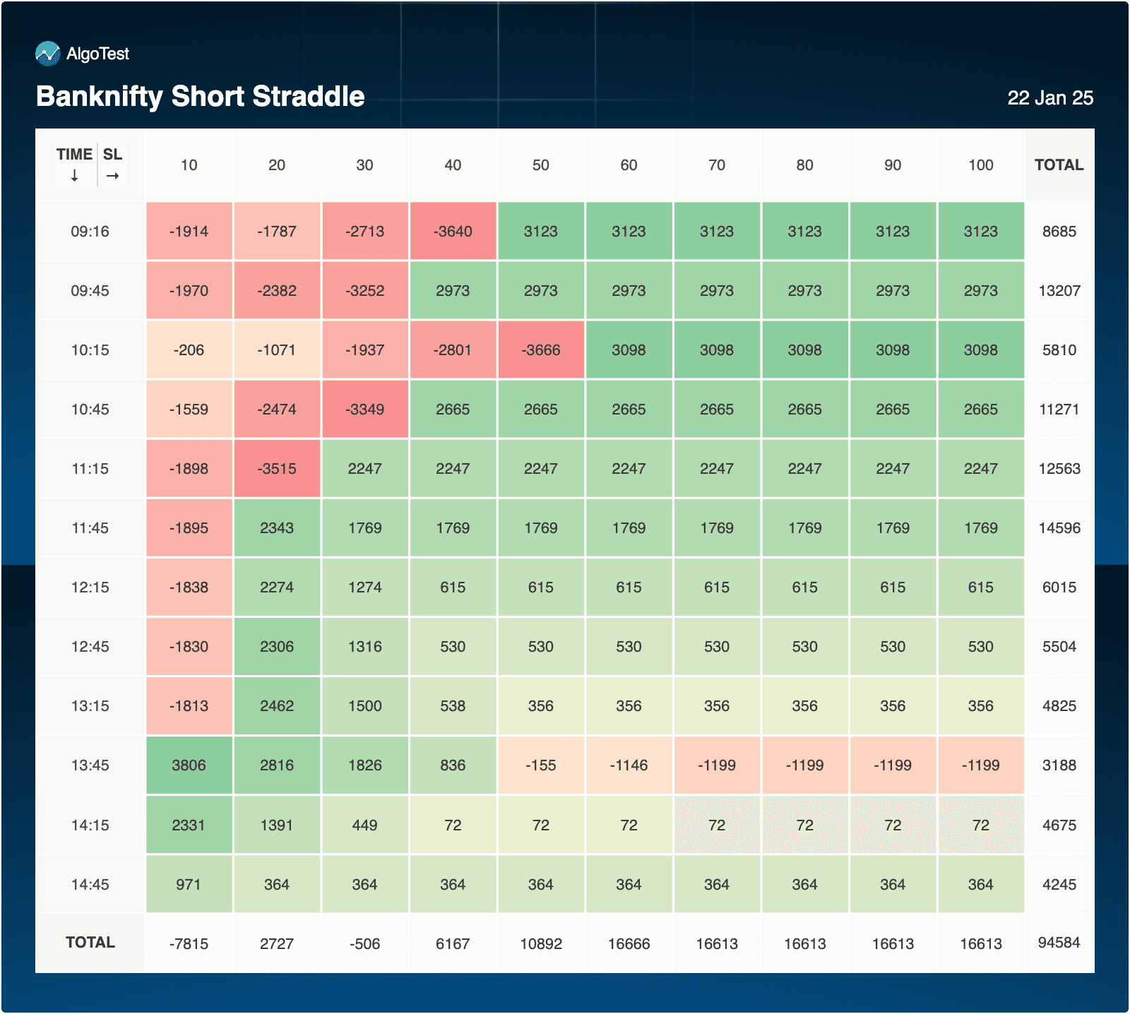 - Mixed performance across time slots, with heavy losses during 10:45 AM (-4,504 at SL 90) and 11:15 AM.