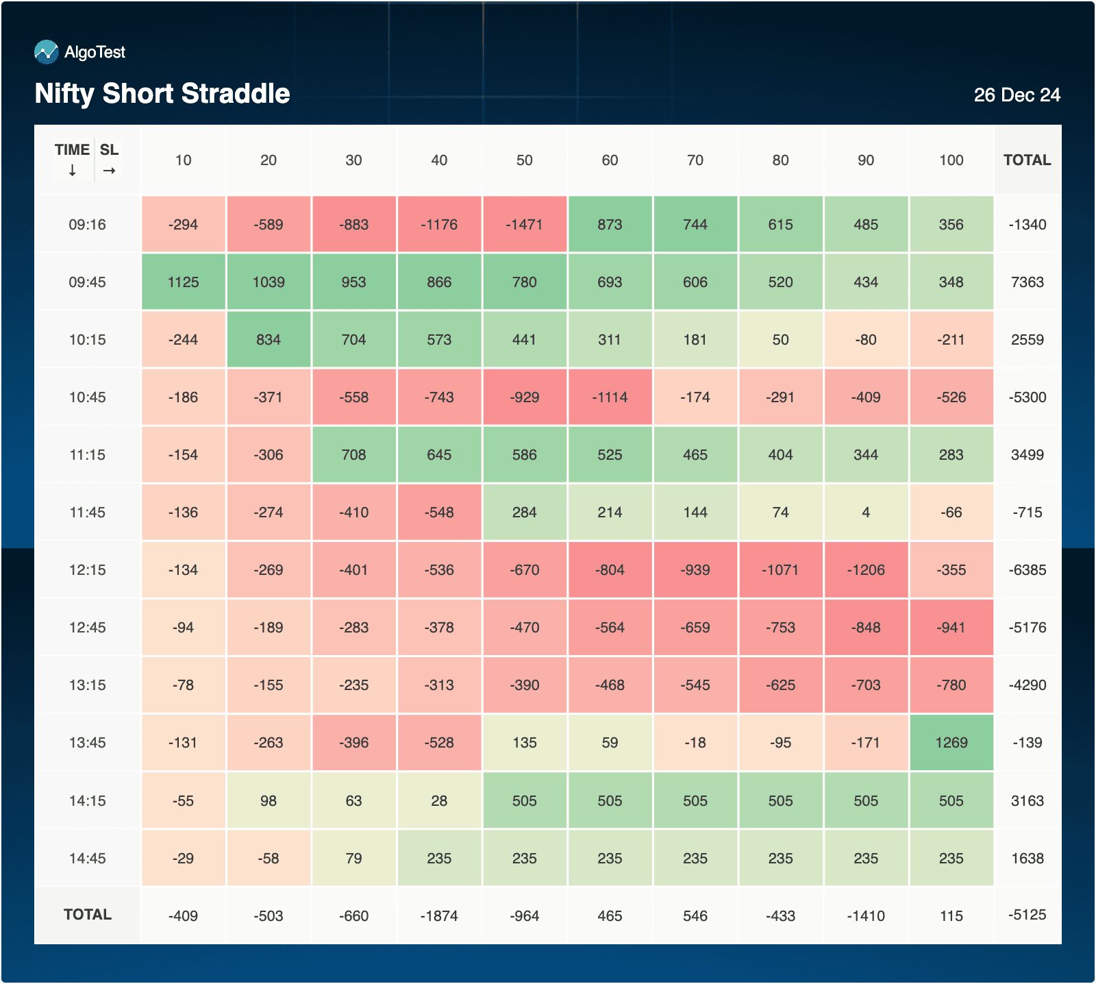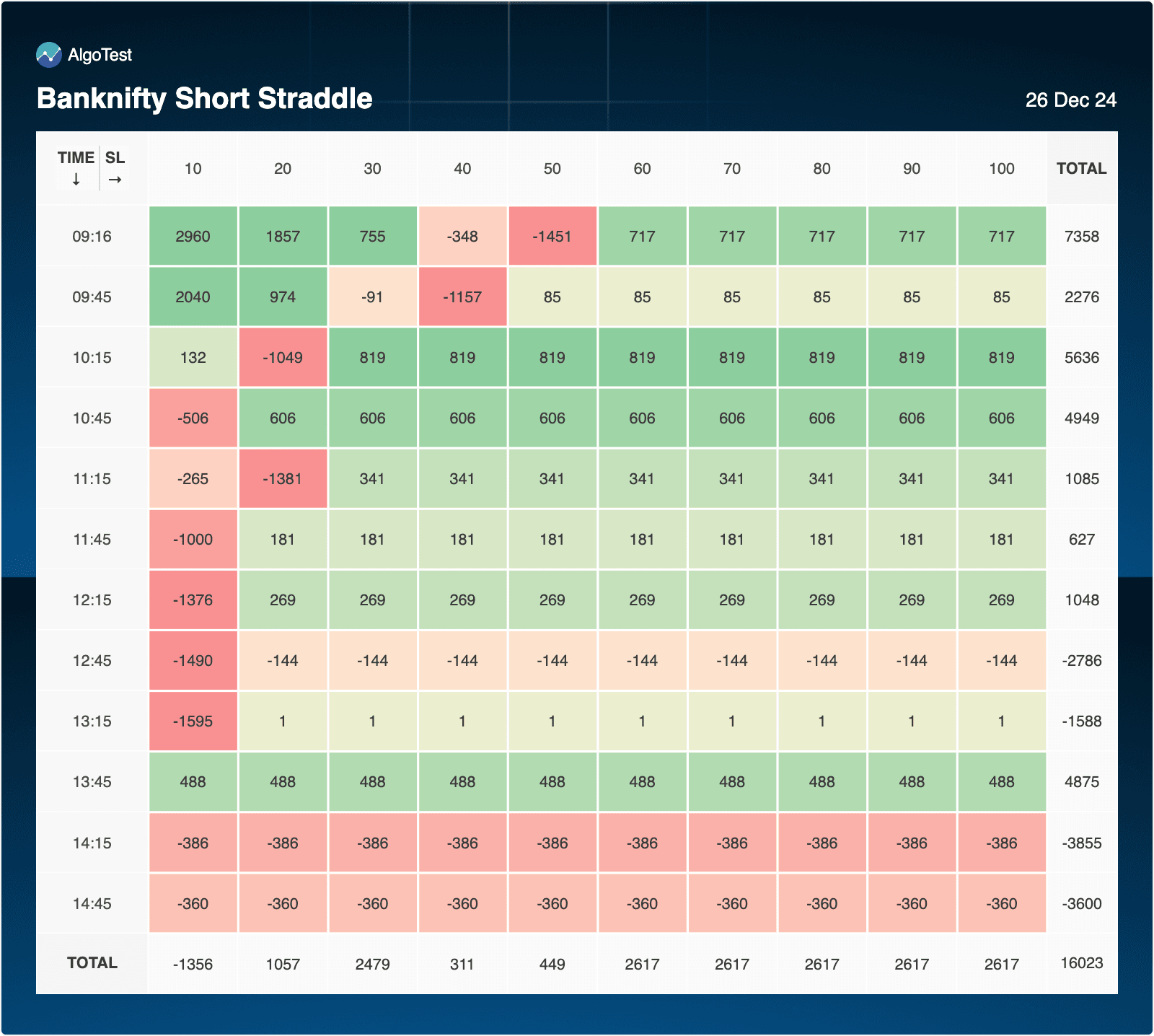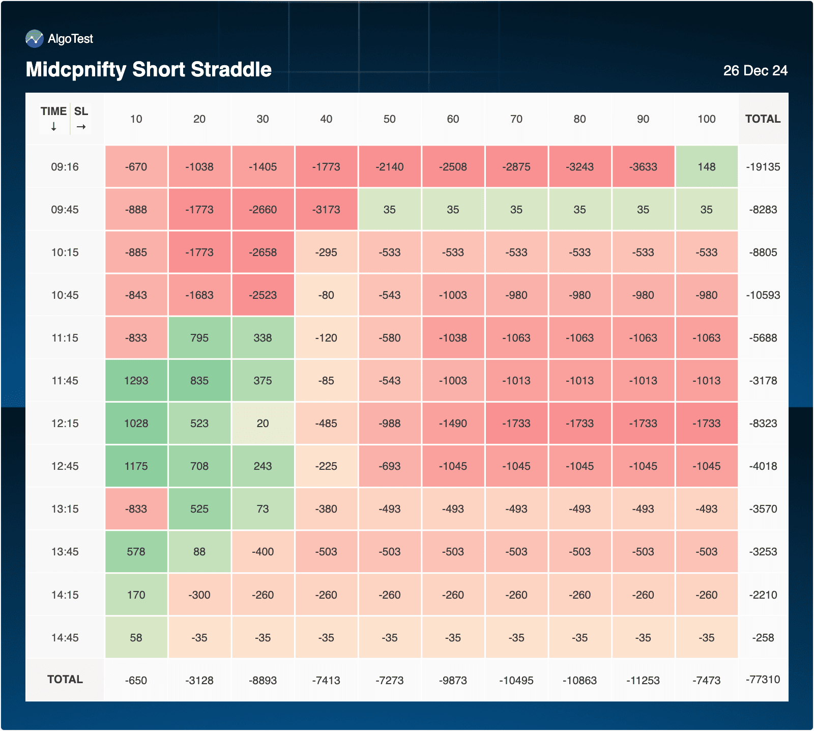 - 09:45 shows some profitability (total: +1629) across SL 10, 20, and 30.
