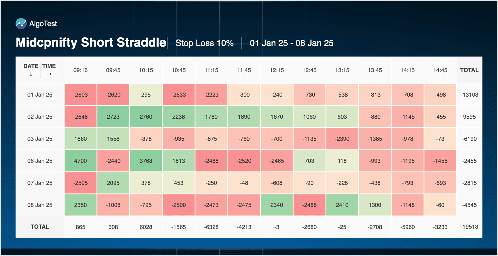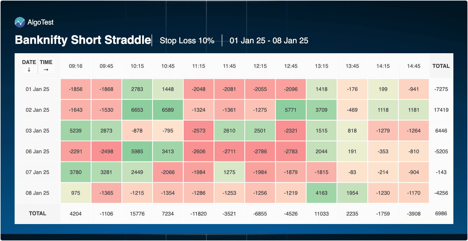 AlgoTest heatmaps make it easier for you to understand a clear picture of your trading performance. These heatmaps visually represent data like time, performance metrics, and win rates. Think of them as a map highlighting where your strategies work best and where they stumble. For example, a heatmap might reveal that trades during certain hours of the day consistently yield higher profits.