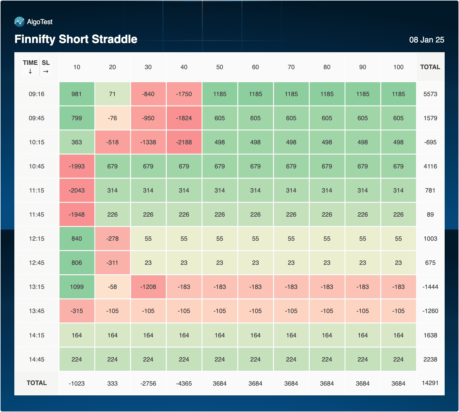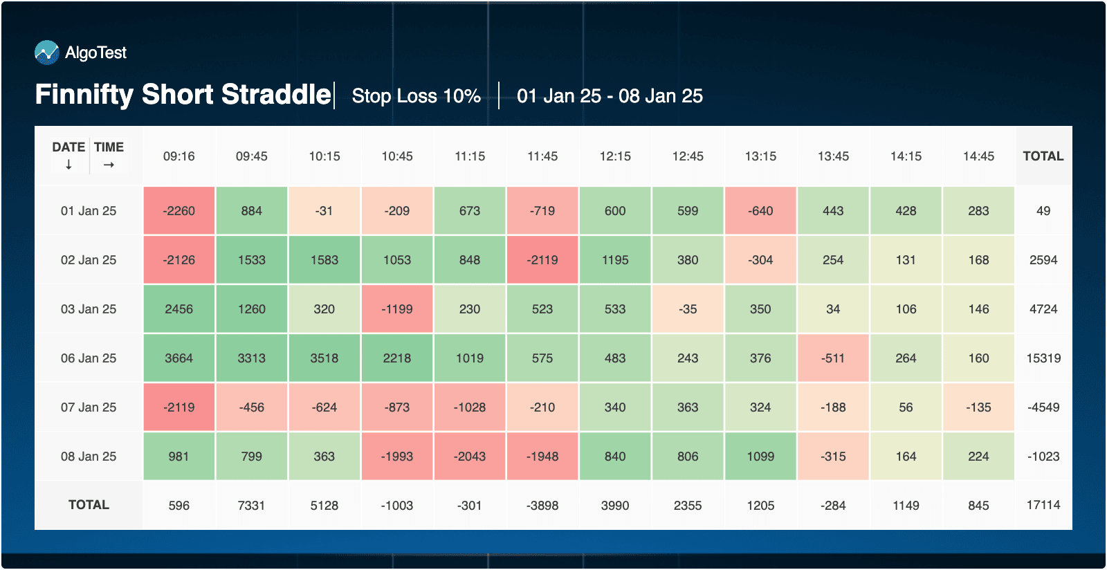 - Midday time slots (12:15 onwards) displayed small but consistent profits across SL levels, indicating FinNifty is less volatile during these hours.