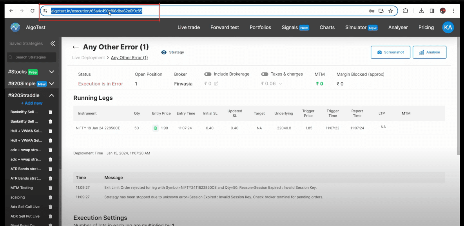 Observe and note down the running leg that has run into the error. This leg can be found in the “Running Legs” section, as you can see in the above screenshot. This is the leg that has to be dealt with on the broker terminal.