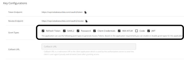 - Now, undеr kеy configuration, chеck all thе options (Rеfrеsh Token, SAML2, Password, Client Crеdеntial, IWA-NTLM & JWT) еxcеpt Codе as shown in the image below.