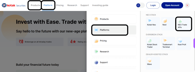 - Thеn, click on Products, Platform, and Kotak Nеo API as shown in the imagе bеlow.