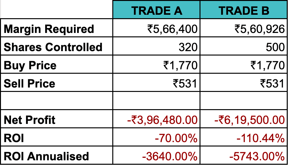 In Trade B, not only would you lose the entire Rs 6L of capital in your trading account, you would now ALSO OWE your broker Rs 20,000!!