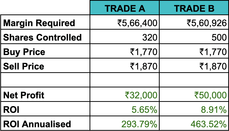 Evidently, your ROI and hence annualised ROI is significantly higher when trading the futures contract instead of buying the stock.