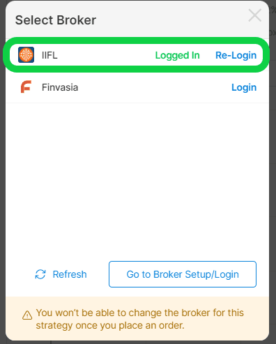 Assuming that we want to execute our Iron Fly strategy, we have two options: we can either paper trade our strategy or execute it on the broker. To execute your strategy for live trading, your broker should have logged into your AlgoTest account. To learn how to set up a broker, Click here.