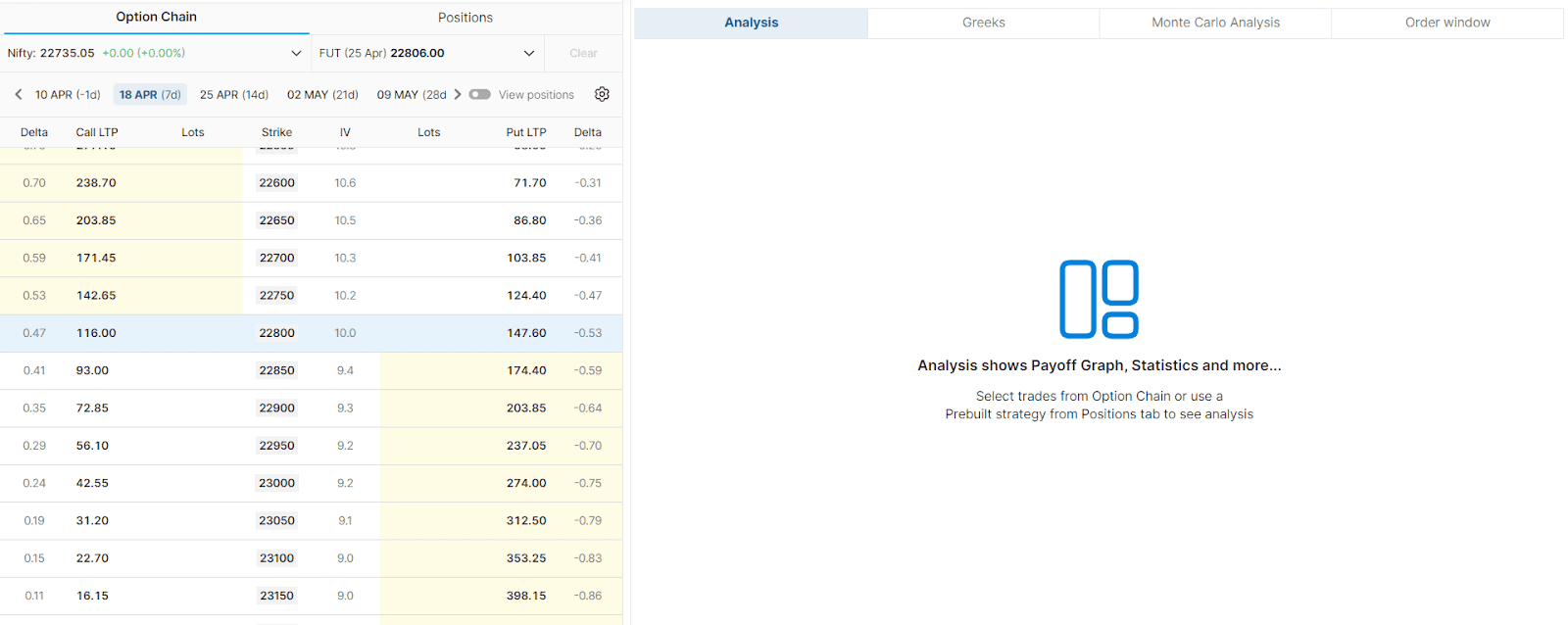Create multi-leg options strategies or modify existing ones based on your risk appetite, view, and capital.