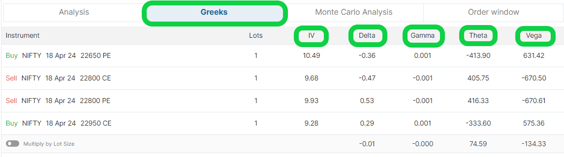 Strategy Builder provides you with information about Option Greeks like Delta, Theta, Gamma, IV, Vega, etc. for your positions, as shown in the image below.