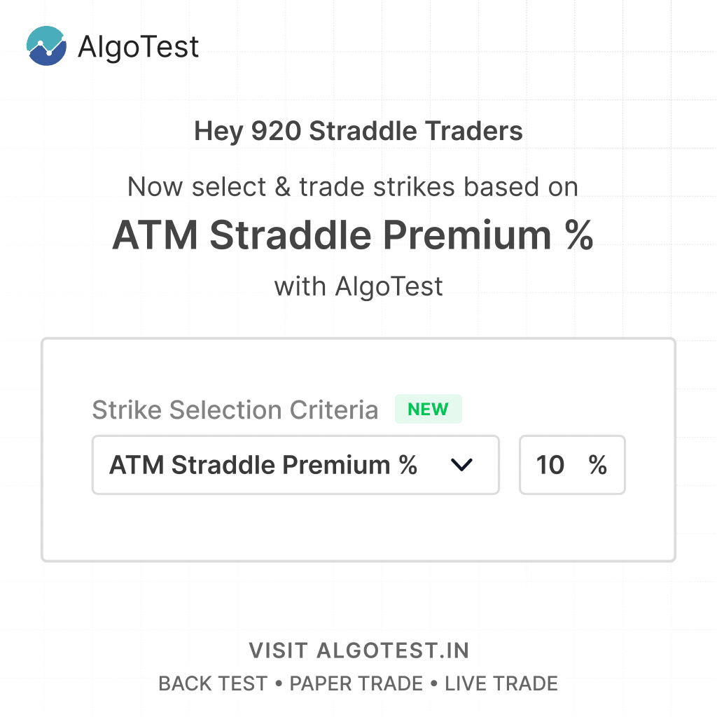 This new feature is now available on the AlgoTest platform. We encourage you to log in and test out the ATM Straddle Premium % for your next trade. As always, our commitment is to equip you with the best possible tools to ensure you stay at the forefront of trading technology.