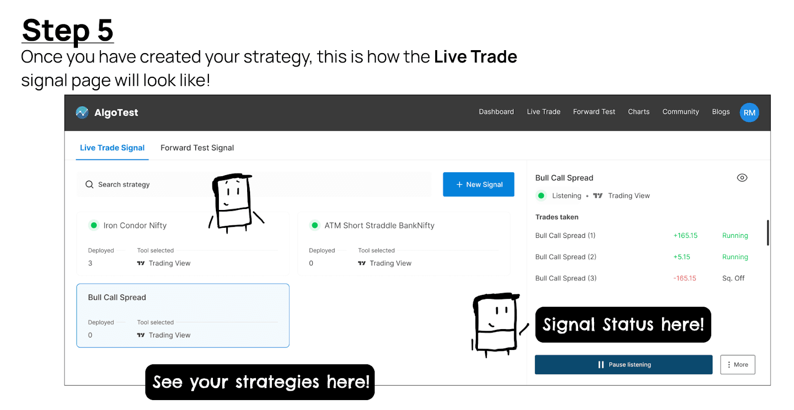 Once you have created your strategy, this is how the live trade signal page will look like!