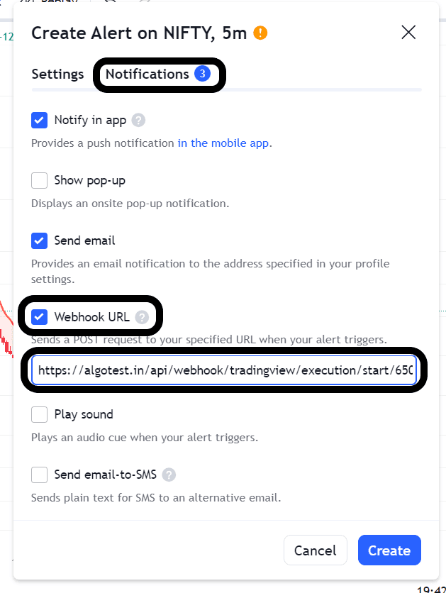 - Now, copy the exit webhook URL from AlgoTest, and paste it into the 'Webhook URL' option within the notification tab, similar to what we did when creating the entry alert.