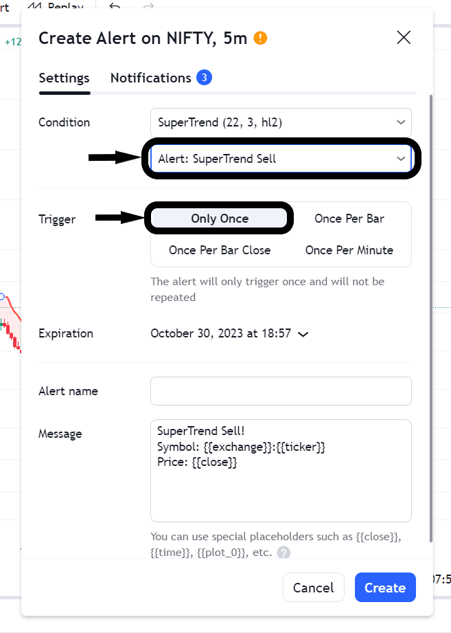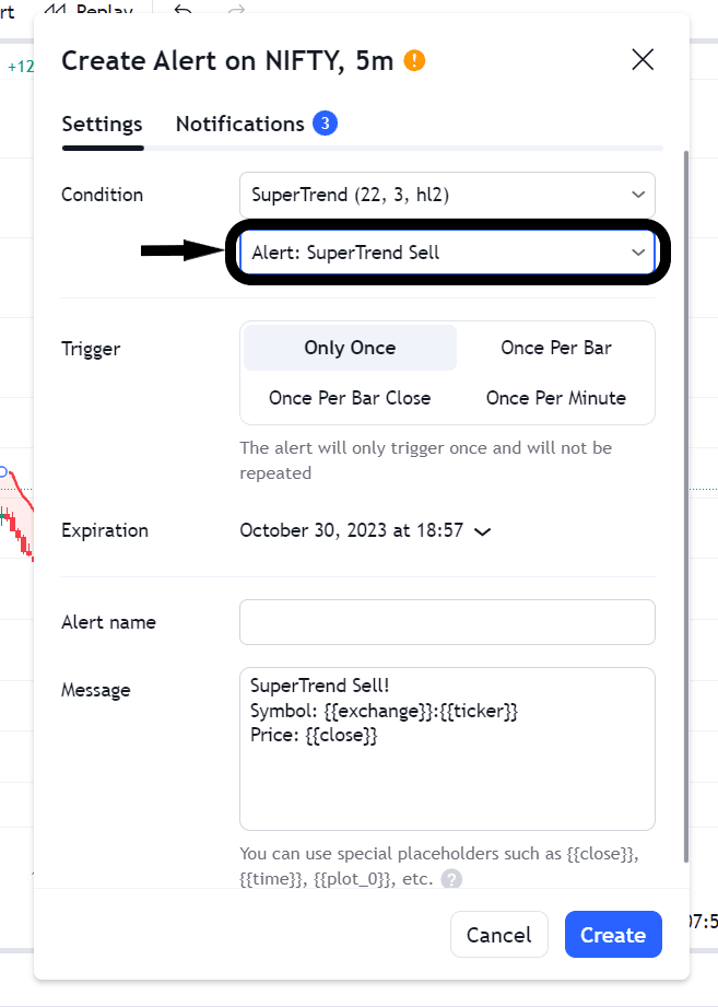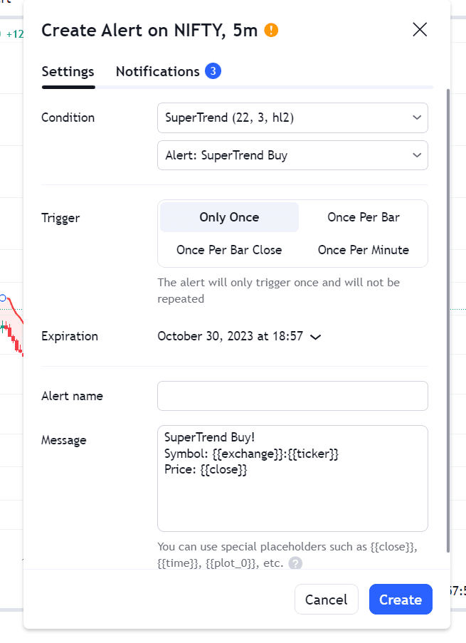 Click on the three dots located on the SuperTrend indicator, as demonstrated in the image above. Then, select 'Add Alert on SuperTrend' (This step involves creating an alert that we will later link to AlgoTest). This action will open a new pop-up that resembles the image depicted below.