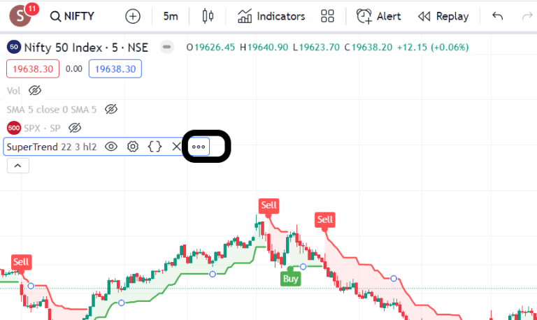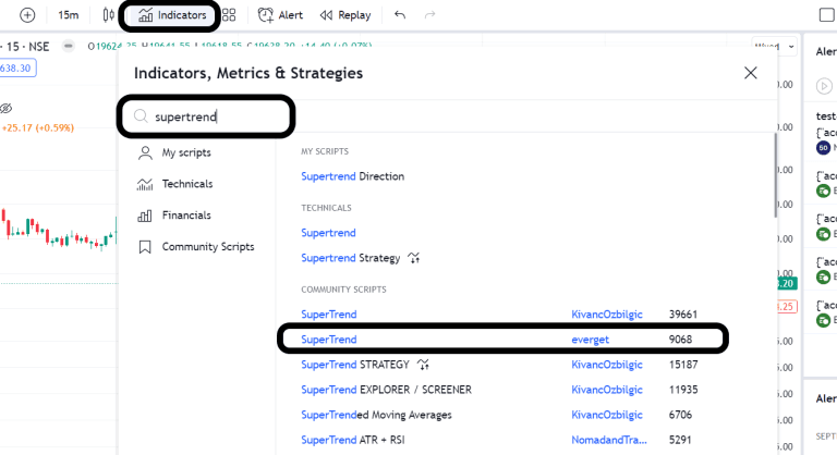 - To begin, navigate to TradingView and open the index chart you wish to trade. For this example, I'm using a 5-minute Nifty chart. Next, we need to add the SuperTrend indicator to the Nifty chart. Locate the SuperTrend indicator in the indicator section, and choose the SuperTrend indicator by Everget, as illustrated in the image below.