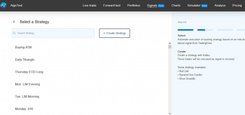 Traders can select their existing strategies created or can create new strategies from starting