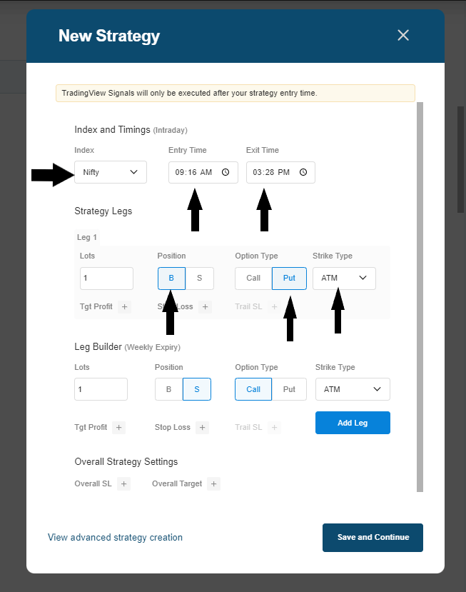 Configure your strategy as demonstrated in the image above, making adjustments as needed to suit your specific requirements. In this strategy, we've included an ATM Put Buy leg.