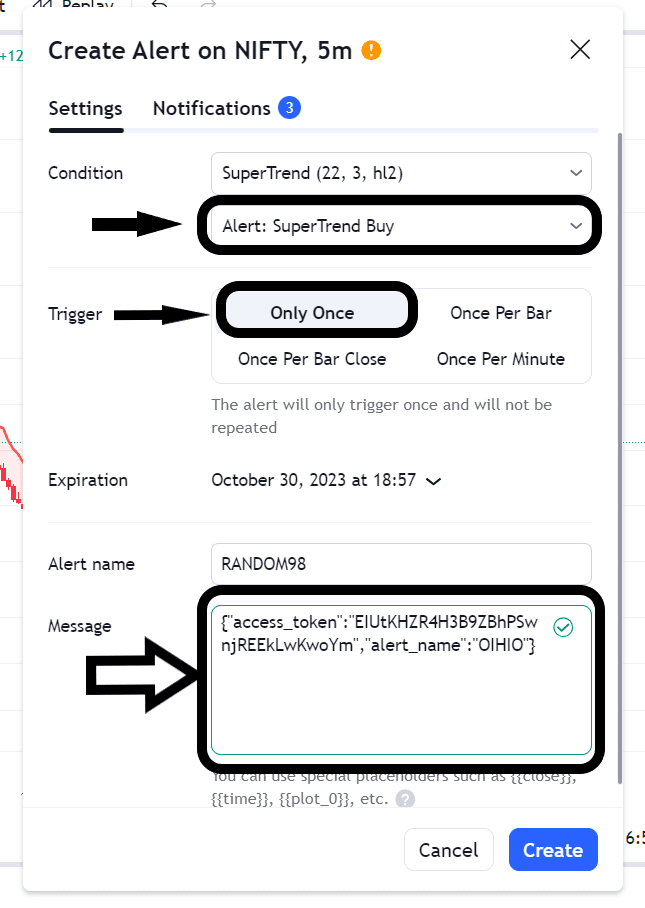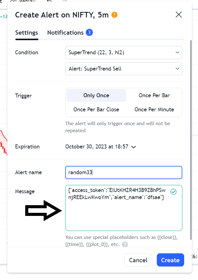 After copying the code, return to the TradingView tab (the Alert Tab that was left untouched) and paste the code into the Message box, which is indicated by a black arrow, as illustrated in the image below.
