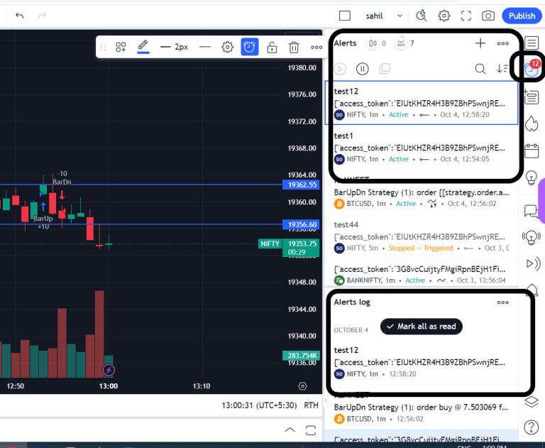 To view your active alerts and generated alerts, you can review the alert section in TradingView, as illustrated in the image below.