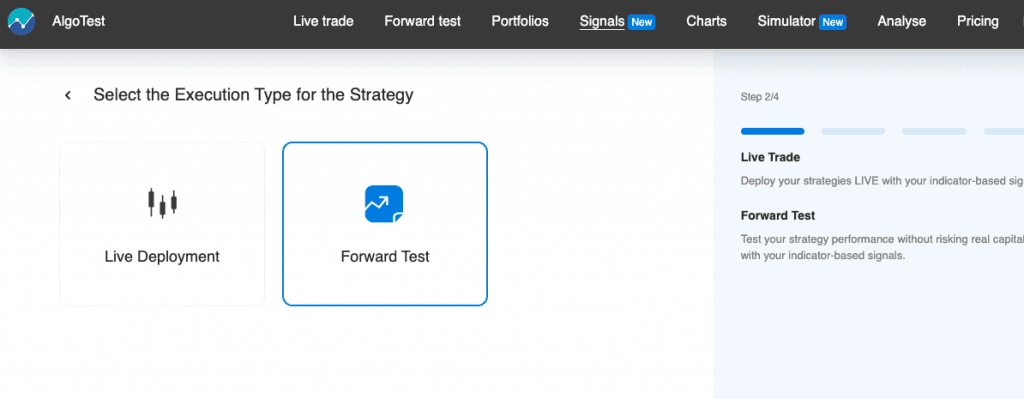 - If you intend to implement this strategy in a live trading environment, click on 'Live Deployment.' If you prefer to paper trade the strategy initially, click on 'Forward Test.' My recommendation is to deploy the strategy in a forward test first to ensure it accurately executes the entries based on the conditions we've set. Please note that the steps for connecting both live and forward trading are identical.